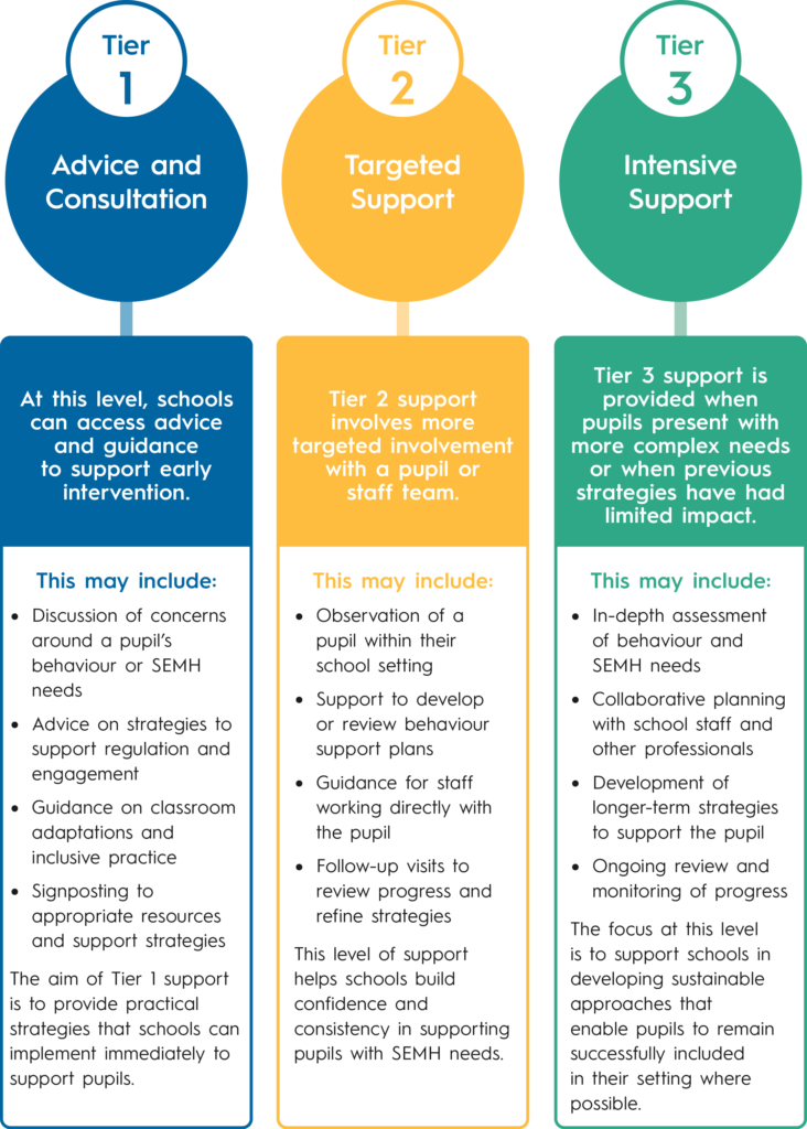 Outreach support is typically provided through a tiered approach, allowing schools to access the right level of support depending on the needs of the pupil, staff team or school.